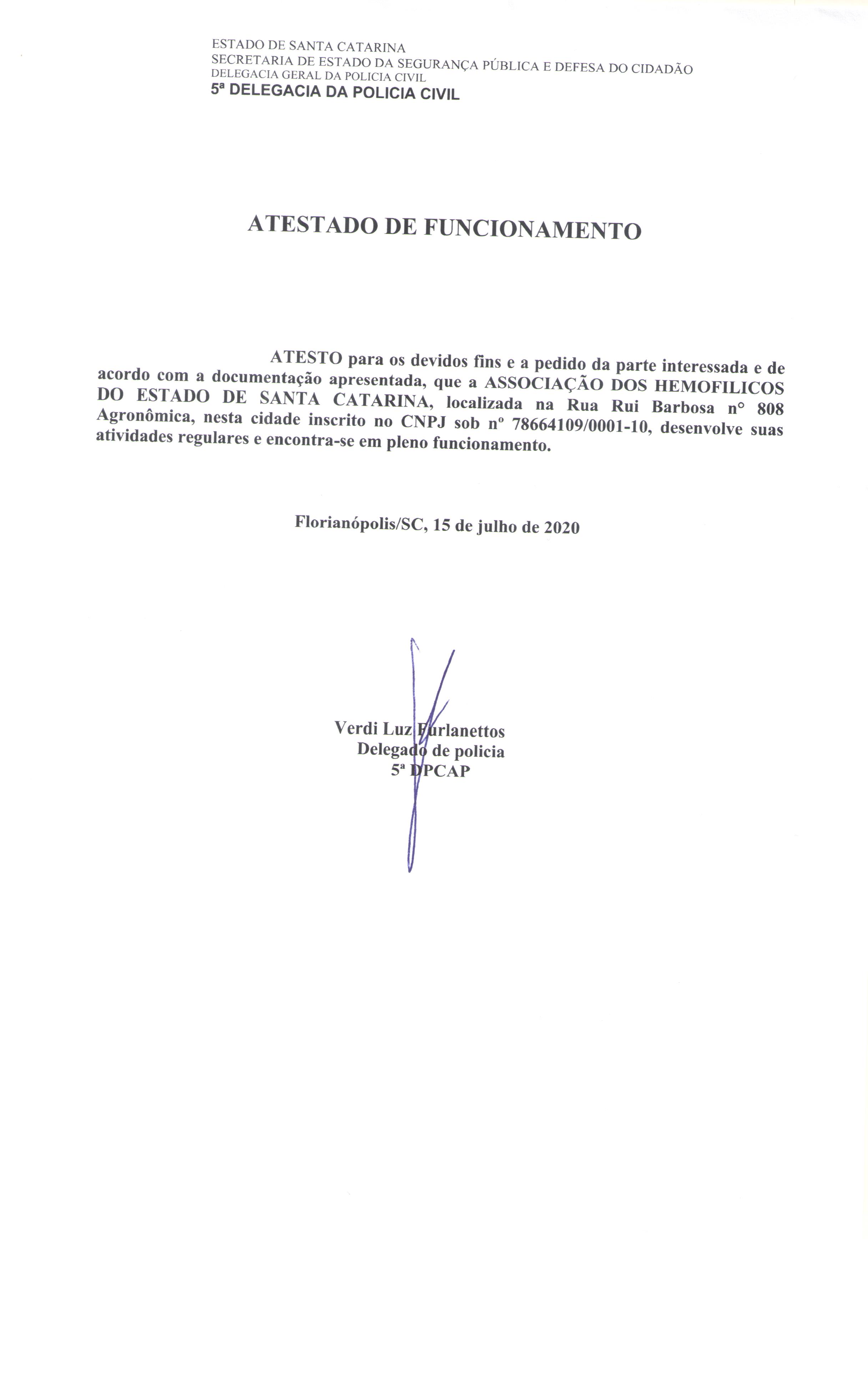 Atestado de funcionamento policia estadual 2020.